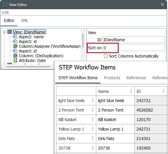 However, when you add a number for the Sort On option to distinguish what column the view should be sorted by, the items are sorted in ascending order. Notice that in the View Editor, the first view the object name appears in the first column. To sort by this, the user types in 2 to represent the first column in this view.