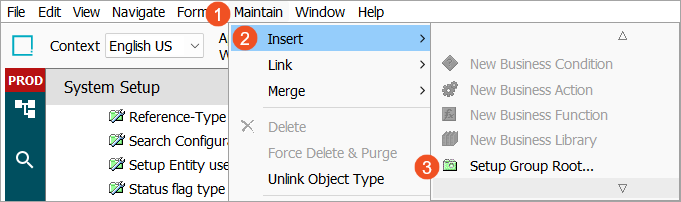 On the Maintain menu, navigate to Insert, and scroll down to select Setup Group Root. This creates a parent node to house workflow instances.
