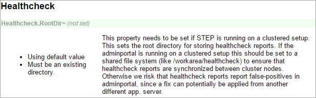 Note: This functionality is managed by a configuration property that is not available in the Self-Service UI. Contact Stibo Systems Support for assistance. Use of this functionality on a clustered environment requires that the Healthcheck.RootDir configuration property be set to a shared path to ensure that the healthcheck reports are available, regardless of the application server node that the admin portal is accessed from.