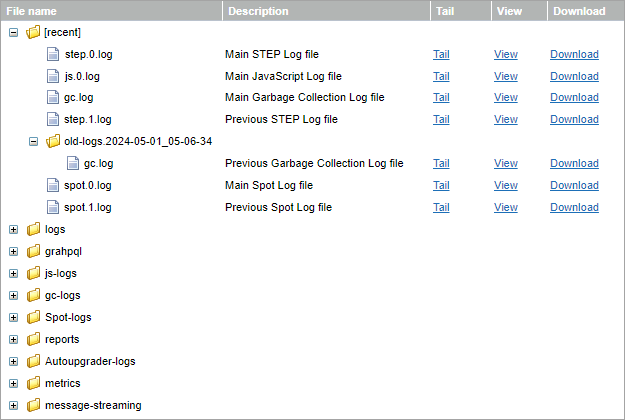 Tail: Displays a truncated version of the log file (with only the most recent content) in a new tab in the browser. This functionality is managed by a configuration property that is not available in the Self-Service UI. Contact Stibo Systems Support for assistance. The amount of data displayed is defined by the Admin.TailSize configuration property (or Admin.TailSizeNoSession property, if applicable).