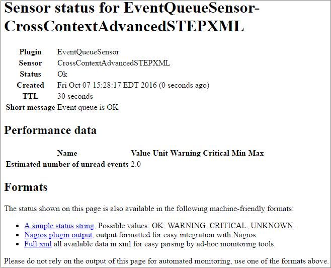 The links in the Formats section can be used to provide detailed information to an external monitoring system, which needs to call the URL that matches a format understood by the monitoring system. Custom formats can be made if the defaults are not sufficient.