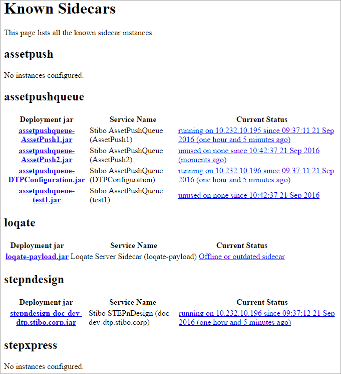 Clicking the List of all known Sidecars link opens the Known Sidecars page in a new browser tab. This page shows a list of sidecars configured on the system and provides links to the associated jar files, as well as links to additional status information.