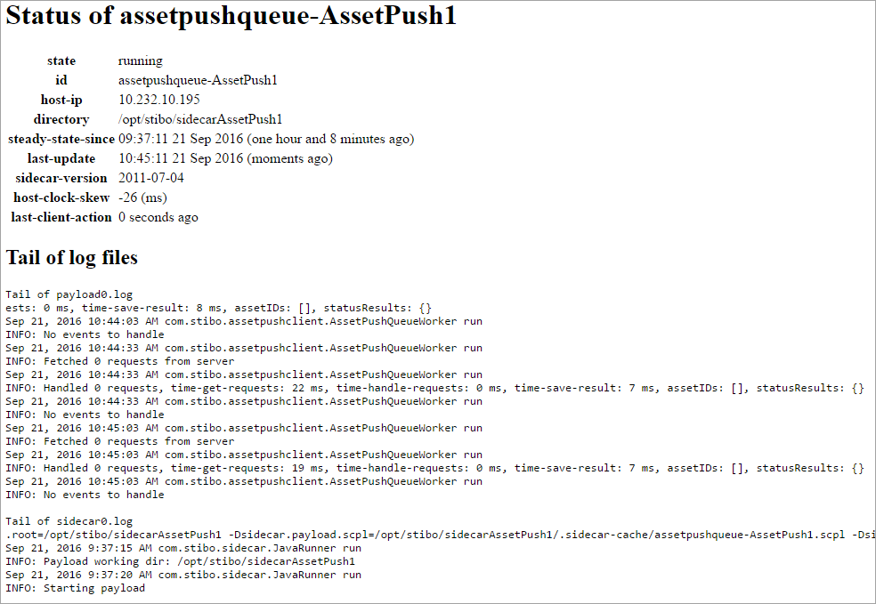 Clicking any Current Status link provides details about the sidecar, including the tail of the recent logs for the sidecar. For example: