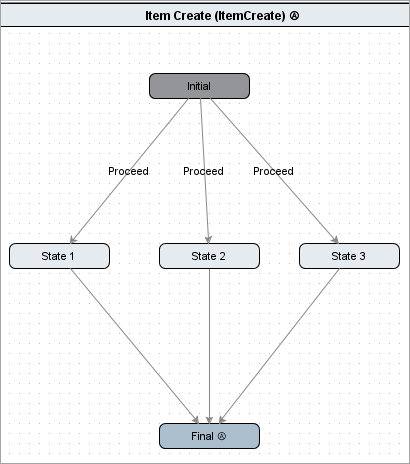 In the following example workflow, there are the 'Proceed' transitions, each going to a different state. When the user selects to Proceed, the transitions are evaluated in the following order: Proceed (State 1), Proceed (State 2), and Proceed (State 3). Each transition is evaluated until one is found that passes the transition conditions.