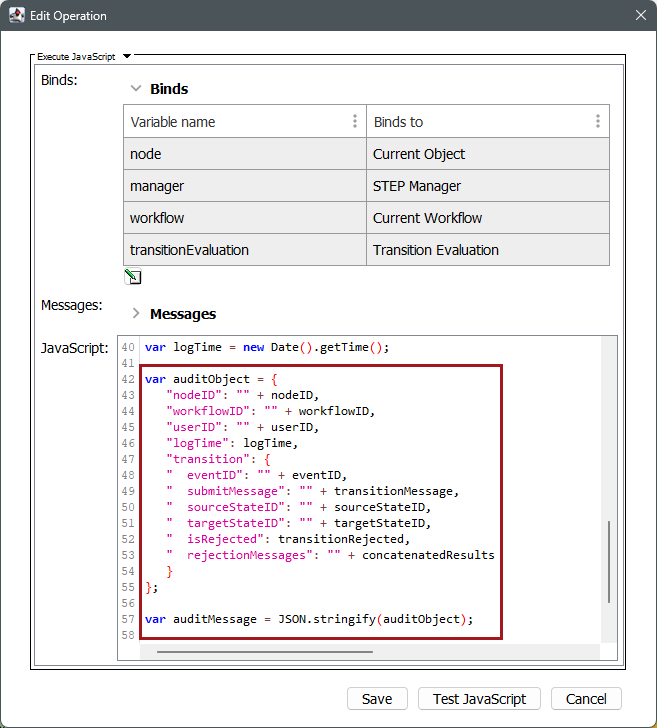 The following screenshot shows a portion of the JavaScript code for the out-of-the-box Workflow Audit Action business action. The highlighted section of the code is what builds the JSON object that is sent as the audit message. The JSON message is received and handled by the plugin associated with a specific topic; in this case, the Audit Message Receiver JDBC database delivery plugin.