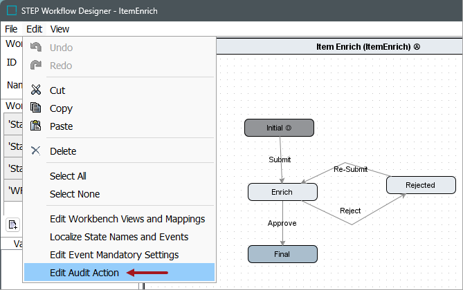 - In the STEP Workflow Designer, click Edit > Edit Audit Action.
