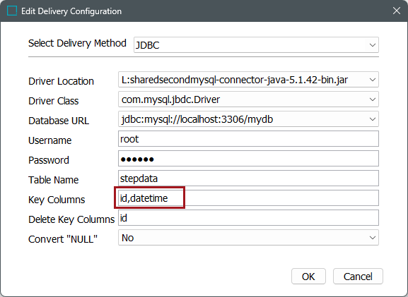 The appropriate delivery configuration for this scenario can be found below. Notice that both the 'id' and the 'datetime' column values are used as keys for the upsert action, meaning both values must match to determine whether to insert or update the object. When an exact match for both keys is found, the object is updated; when no match is found, the object is inserted.