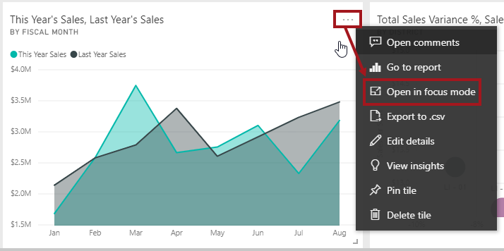 - The Dashboard Tile ID is available by selecting the relevant dashboard when viewed in Power BI, then clicking the ellipsis (...) that appears when hovering over a dashboard tile and selecting 'Open in Focus Mode.'