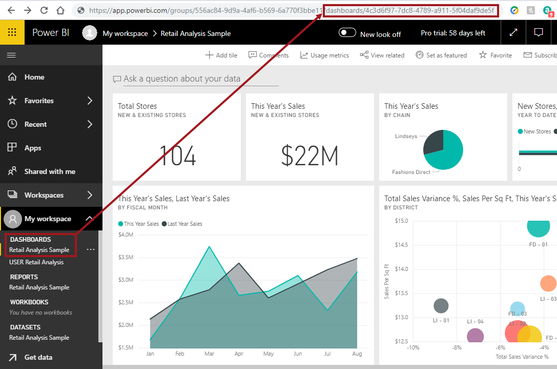 - The Dashboard ID is available by selecting the relevant dashboard when viewed in Power BI and inspecting the URL. For example: https://app.powerbi.com/groups/556ac84-9d9a-4af6-b569-6a770f3bbe11/dashboards/4c3d6f97-7dc8-4789-a911-5f04daf9de5f.