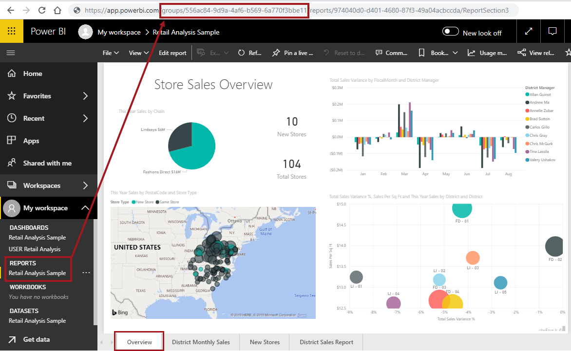 In the above screenshot, the Overview tab is the report page. Other report pages can be viewed by clicking on another tab (e.g., District Monthly Sales or New Stores). When another page is selected, the URL will then show the page ID of the selected page.