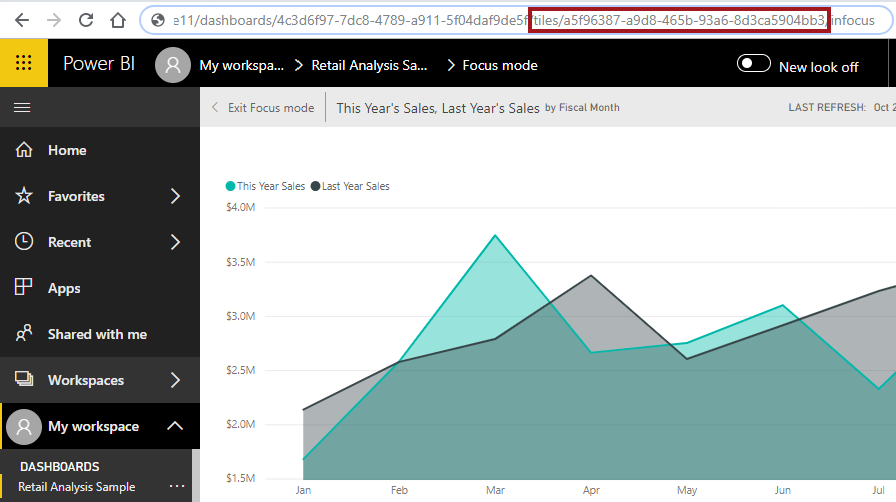 The tile opens in Focus mode, and the ID of the tile is available in the URL. For example, https://app.powerbi.com/groups/556ac84-9d9a-4af6-b569-6a770f3bbe11/dashboards/4c3d6f97-7dc8-4789-a911-5f04daf9de5f/tiles/a5f96387-a9d8-465b-93a6-8d3ca5904bb3/infocus