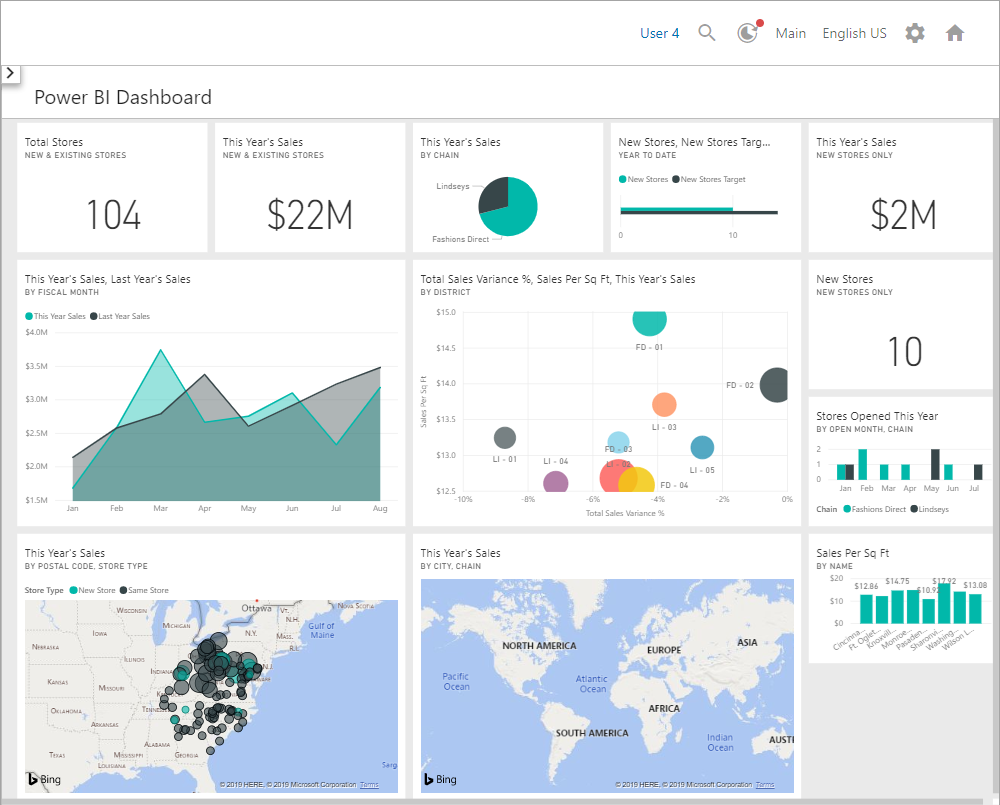 The following screenshot shows a sample Power BI screen in the Web UI displaying several Power BI tiles as part of a Power BI dashboard.
