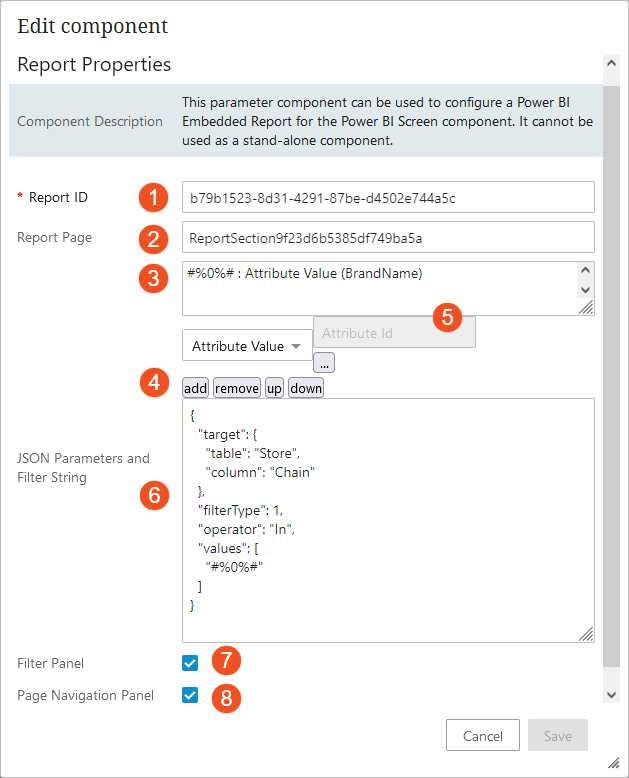 This section contains two fields. The top field (3) is for JSON filter parameters. The bottom field (6) is where the JSON filter string is entered. Use these options to further limit the data that users can refer to, and/or to configure the filters that display in the optional Right Filter Panel, which is addressed in more detail later in this topic. For more information on using JSON strings to filter Power BI reports, refer to the Example Power BI Report Filters topic.