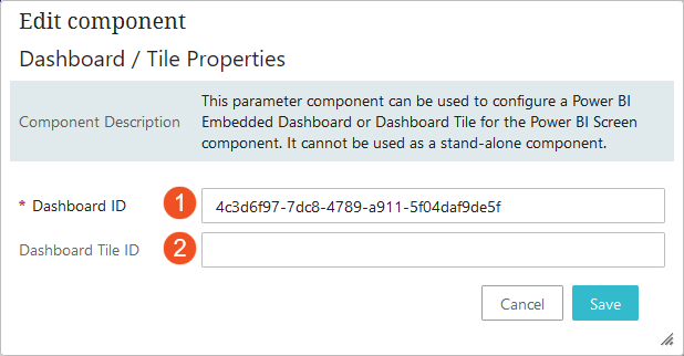 - Dashboard Tile ID: Enter the ID of the relevant Power BI dashboard tile. This option will cause the Web UI screen to be composed of a single tile.