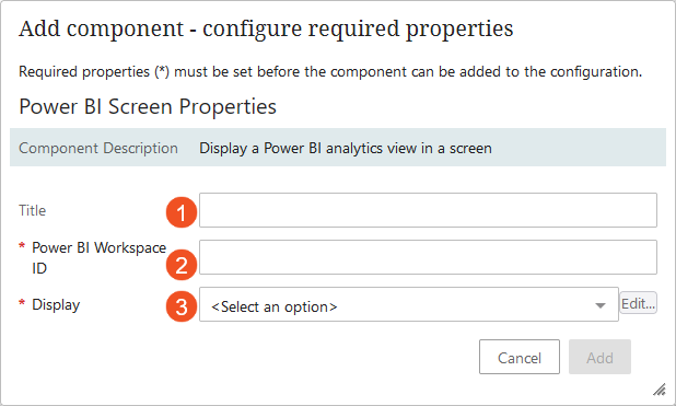 The Power BI screen must be added before it can be configured as described below. The method for adding screens in the Web UI is detailed in the Design Mode Basics topic in the Web User Interfaces documentation.