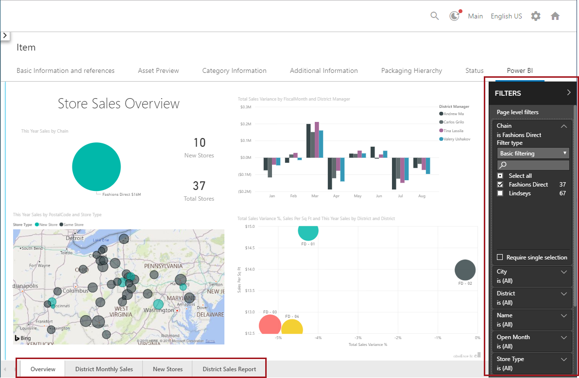 The following screenshot shows a sample Power BI report on a Power BI screen in the Web UI. An optional filter panel is shown on the right side of the screen, and an optional page navigation panel appears on the bottom.
