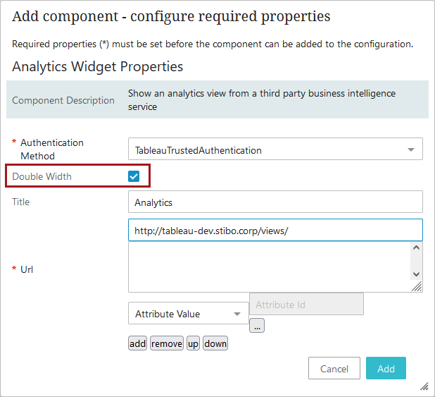 The Analytics Widget Properties window in which users configure the widget is shown below. The only parameter for the analytics widget that is different from those used to configure the analytics screen is the 'Double Width' parameter (indicated by a red box in the screenshot below). This parameter determines the width of the widget. The size of the dashboard display is configured in Tableau, but it is recommended that this box is checked to create a widget in the Web UI that is double-width. This allows the most information to be displayed.