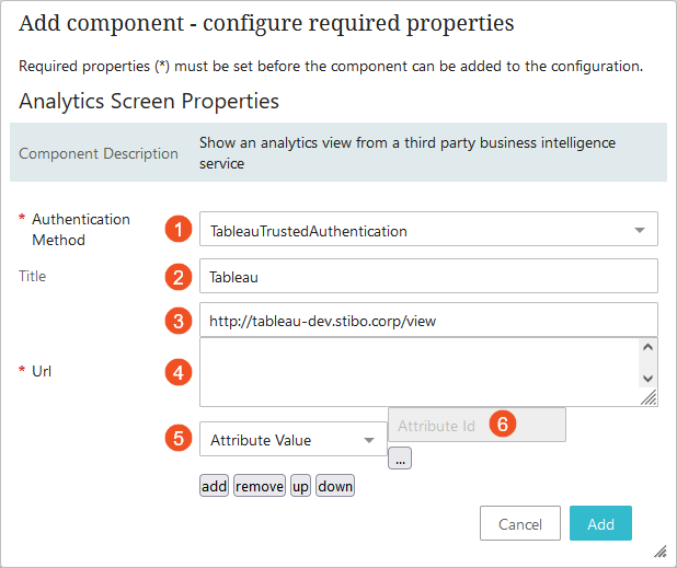 - Authentication Method: This parameter enables users to configure automatic access to Tableau or Qlik dashboards through the Web UI analytics component (screen or widget). For more information on setting up authentication in the Web UI, refer to the Configuring Authentication section at the end of this topic.