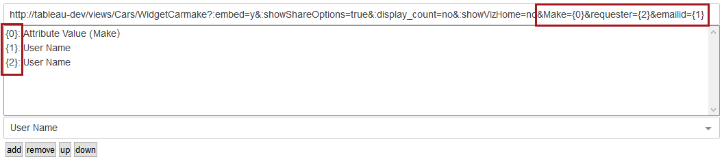 As shown in the screenshot above, the selected attributes are listed along with a braced number (ex. '{0}'). These braced numbers act as placeholders that can be manually added into the URL. Adding these braced numbers into the URL actuates a dynamic view of the dashboard.