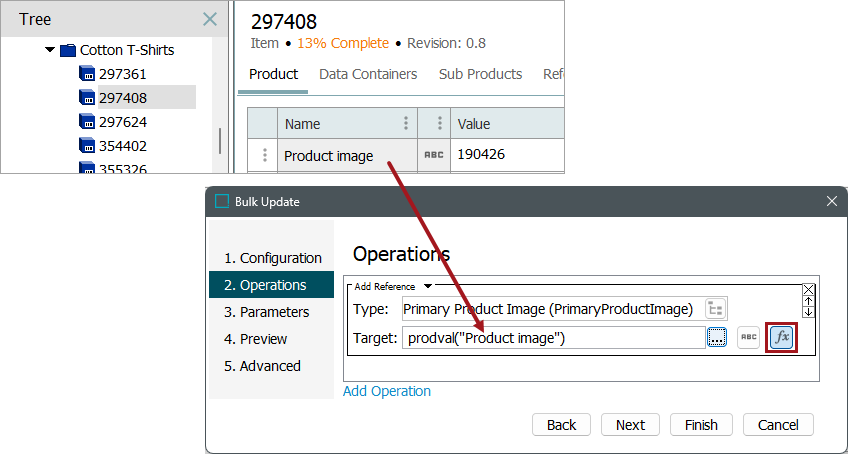 After selecting the 'Type' of reference, a user opens the function editor and types in the function needed. In this case there is an attribute on the item called 'Product Image' that holds the ID of an image asset.
