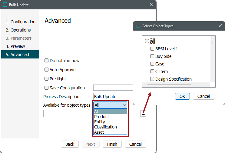 Available for object types limits the object types and nodes affected by the bulk update operations. Select an object type from the dropdown and then click the ellipsis button (