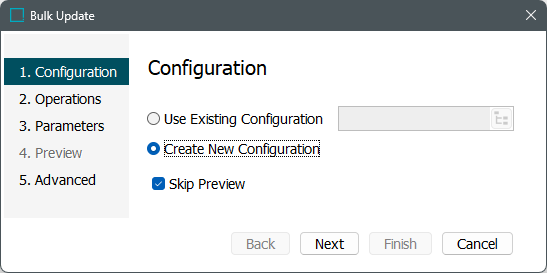 Note: To run a saved bulk update configuration (which loads the operations and settings) first start the wizard, and then choose the existing configuration on the Configuration step shown below.