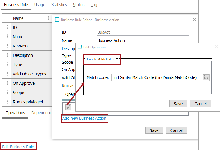 ) to display the Select a Match Code dialog, and the relevant match code. - Click the Save button to add the operation to the business rule editor.