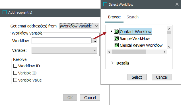 - When Workflow Variable is selected, the Workflow Variable and Resolve groups of parameters are displayed. An email address can be read from a workflow variable. This requires that the object the business action is executed on has been initiated in the specified workflow. For more information on workflow variables, refer to the Workflow Variables topic in the Workflows documentation.