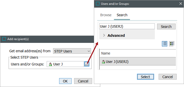 - When STEP Users is selected, the Users and/or Groups parameter is displayed. click the ellipsis button (