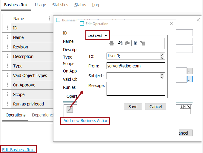 - On the Edit Operation dialog, select the Send Email option from the dropdown.