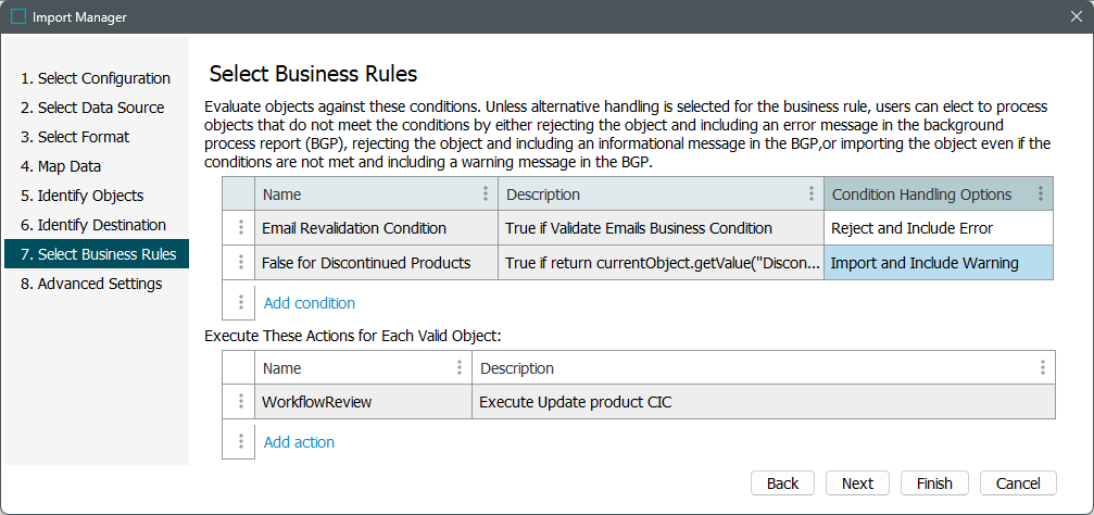 Based on the Condition Handling Option selected for each business condition, business conditions will run in the following sequence: those with 'Reject and Include Error' selected, those with 'Import and Include Warning' selected, and those with 'Reject and Include Information' selected.
