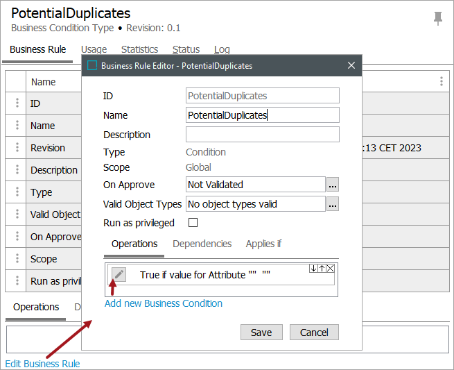 6. The 'Edit Operation' dialog opens. In the field 'Referenced Business Condition', select the business condition you wish to invert.