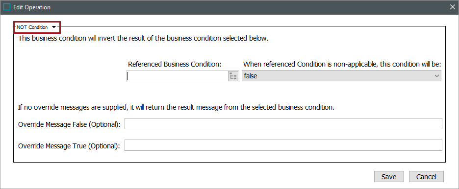 Note: The 'NOT' condition allows business rule writers to override message(s) generated by the inverted business condition using the 'Override Message' fields.