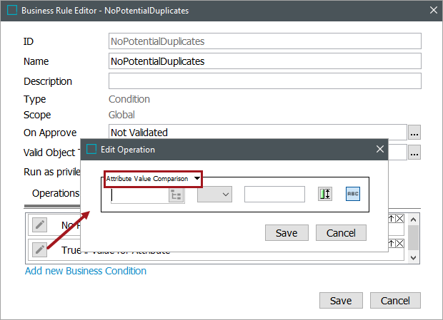 - Click the Edit Operation icon for the newly added business condition. This button is also available from the Business Rule tab.