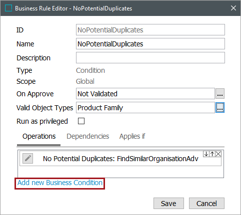 - In the Edit Operation dialog, use the dropdown list to select the preferred condition. The conditions are described in the Business Conditions topic.