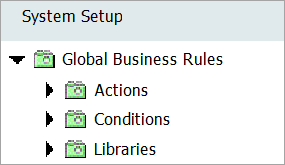 1. In System Setup, identify the setup group object type instance configured to hold business rules. In this example, the Global Business Rules instance is configured to hold actions, conditions, functions, and libraries.