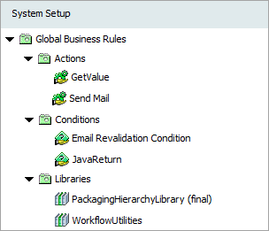 The following hierarchy shows a setup group object type instance named Global Business Rules that is configured to hold actions (for example, Get Attribute Value), conditions (for example, Object Damaged), functions (for example, Check for Allergens), and libraries (for example, Workflow Utilities).