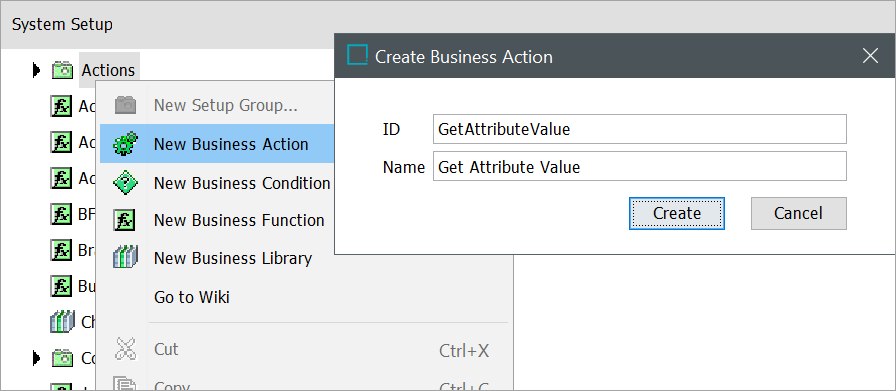After completing the one-time configuration, business actions, business conditions, business functions, and business libraries can be created in System Setup.