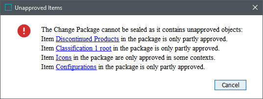 Note: Consider noting the full list of items and systematically approving them all before attempting to seal the change package again. Or use the 'Seal Package' option to display the Unapproved Items dialog again.