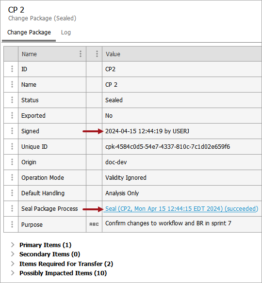 For more information on the items in the Primary Items section, refer to the Statuses and Discrepancies in Change Package Items topic.