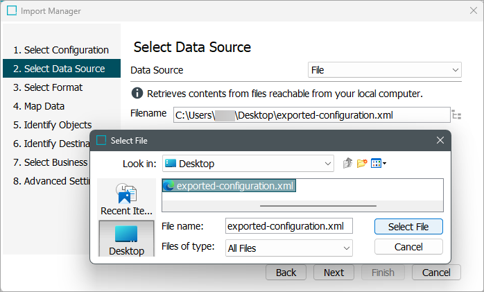 ), browse to where the 'Configuration-Export.xml' file is saved, select it and click the Next button.