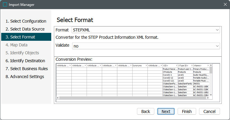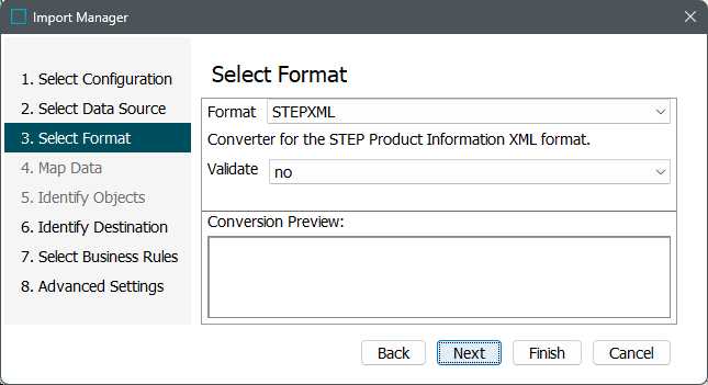 In the Select Format step of the Import Manager, STEP should automatically recognize the file as a STEPXML file. Confirm that Format is 'STEPXML' and click Finish.
