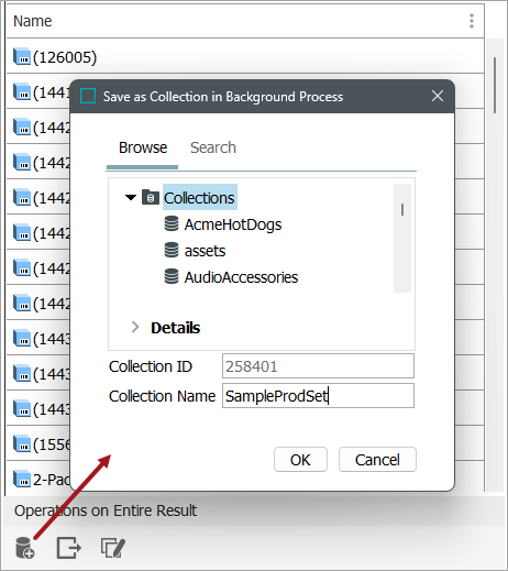 Click the Save as Collection button at the bottom of the search panel to store the result in a Collection.