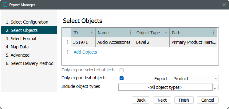 In the Select Objects step of the Export Manager, depending on which approach you have chosen, either select the root nodes for the sample product hierarchies you would like to export or select the Collection created earlier and click Next.