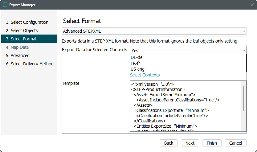In the Select Format step of the Export Manager, under 'Export Data for Selected Contexts,' select the Contexts for which data should be exported. Notice that this is only relevant if the configuration objects and data nodes are dimension dependent (e.g., language-specific attribute names and LOV values). Click Next to continue.