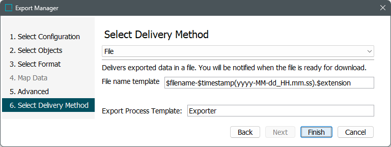 In the Select Delivery Method step of the Export Manager, ensure that the File option is selected and click Finish.