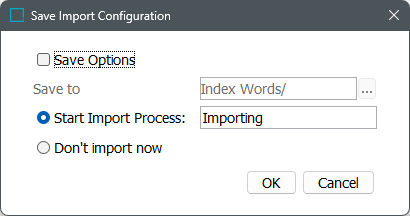 In the Save Import Configuration window, uncheck Save Options if selected, and click OK to start the import process.