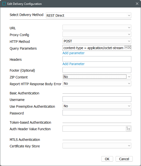 3. Configure the OIEP with a REST Direct delivery method as follows. Use the shown values as defaults, select an appropriate URL, and include the required authentication options for a user with sufficient privileges.