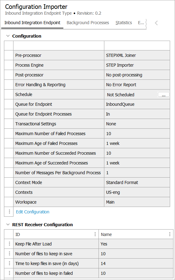 The endpoint must be configured to import STEPXML (by providing any valid STEPXML file as a sample file) and can be configured with any receiver method capable of handling .ZIP files, for example, the 'Hotfolder Receiver' or the 'REST Receiver'. If workspace revisable objects like products and classifications are imported, set if import changes should be automatically approved.