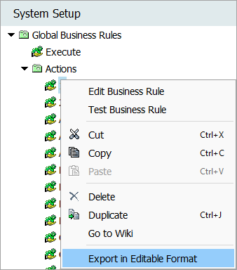 To manually export business rules individually, from a System Setup node that houses business rules, right-click and select the 'Export in Editable Format' option as shown below: